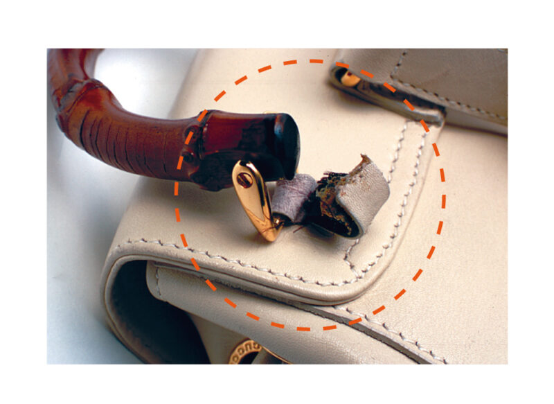 バッグの付け根は、一番負荷がかかって傷みやすい部分。ねじれたり、金具があたったり、劣化して革がちぎれたり(切れたり)…💧