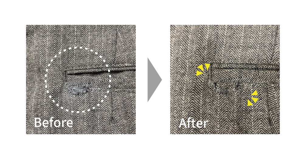 破れた部分に糸を一本一本織り込む高度な技術で、費用はかかりますが「ほぼ元通り」に見える仕上がりになります✨