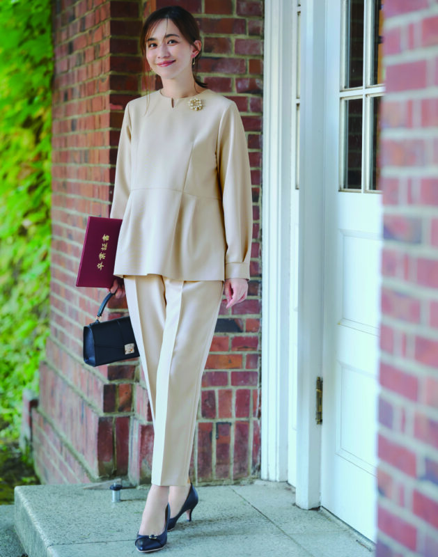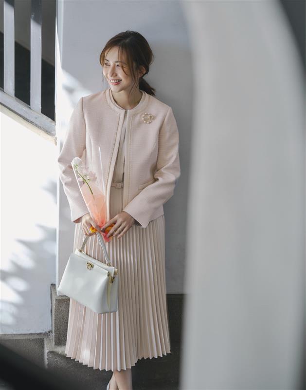 女性らしい印象で着られる上品なツイードノーカラージャケットを合わせてセレモニーはもちろん、顔合わせや食事会、ハレの日の装い、きれいめ通勤着としても幅広く活躍します。