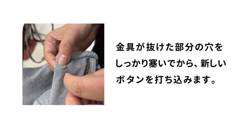 当店では、金具が抜けたところの穴をしっかり塞いでから、その上に新しい金具を打ち込みます🔨