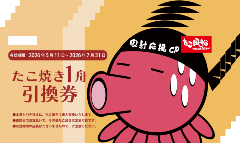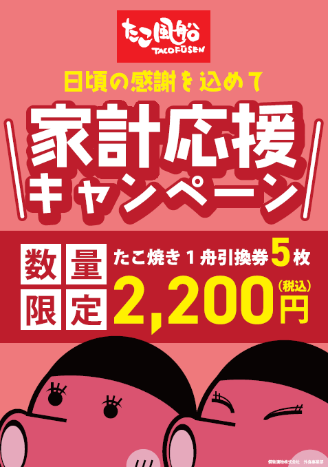 4月28日(火)より、『たこ焼き1舟引換券』×5枚 1セット2,200円(税込)で販売いたします!