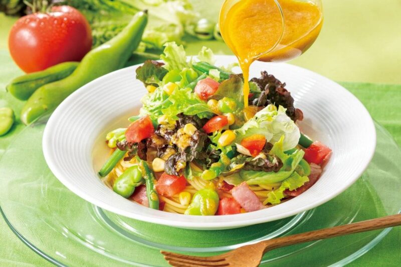 ペペロンチーノスパゲッティの上に彩りゆたかな夏野菜をたっぷり乗せたサラダパスタです