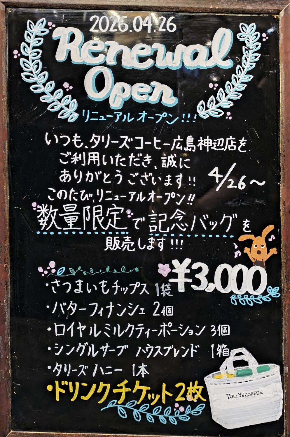 2026.4.23 4月26日 リニューアルオープン!! こんにちは。タリーズコーヒー広島神辺店です。 4月26日、広島神辺店はおかげさまで20周年を迎えます。 いつもご愛顧を賜りありがとうございます。 また、店舗は22日から改装を行っております。 26日に改装後リニューアルオープンとなります! 4月26日に20周年、リニューアルオープンを記念しまして記念バッグを販売いたします。 ドリンクチケット2枚が入ったお得なセットです。 30個限定 となっております! 26日、ぜひお早めにお越しくださいませ。 皆さまのお越しを心よりお待ちしております。