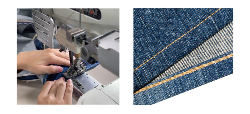 デニムの裾上げの こだわりのひとつに【チェーンステッチ仕上げ】があり、裏側が鎖状になっている縫い方のことで、洗濯をすると糸の縮みによって縫い目が詰まり、生地との縮み方の違いから、パッカリングと呼ばれるねじれができるのが特徴です。