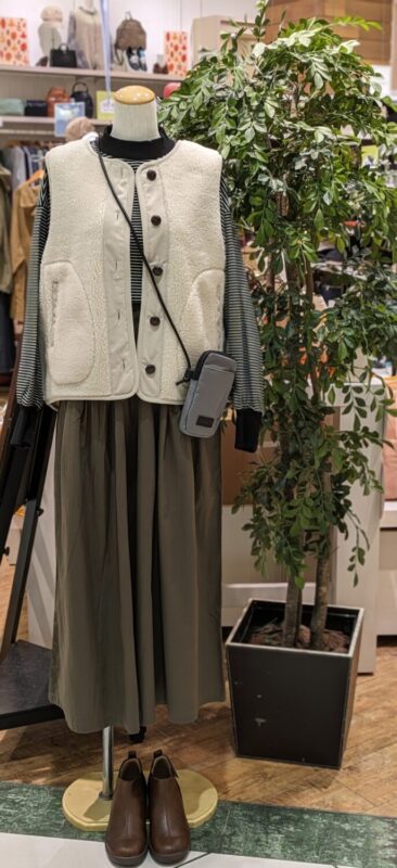 アイボリーのボアベストがシーズンムードをぐっと高め、見た目も暖かい印象に。