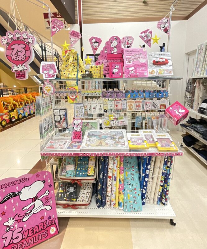 SNOOPYの75周年を記念して、現在SNOOPY特設コーナーを設置しております。今大人気のダイアモンドフィックスや可愛い生地、ワッペンなど、新作も数多く入荷しております。また、現在SNOOPYグッズをお買い上げのお客さまには特別シールもプレゼント中です。こちらは無くなり次第終了のため、気になる方はお急ぎください。店頭にてお待ちしております。