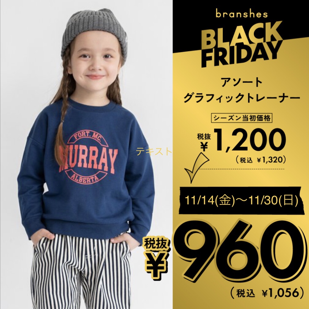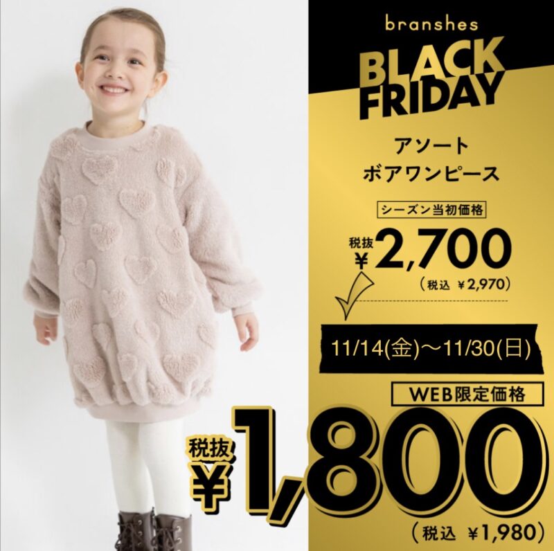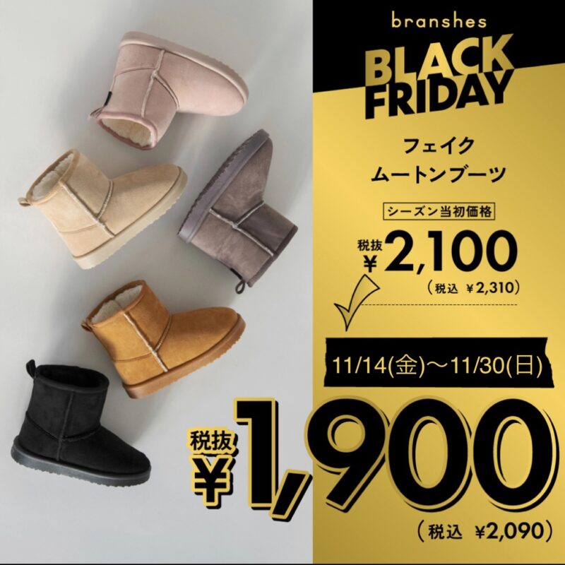 2025.11.14 BLACK FRIDAY スタート Screenshot 11/14〜30 branshes恒例 BLACK FRIDAY開催します Screenshot 第一弾は 対象トレーナーが¥960(税込¥1056) そのほかボアブーツ、ボアワンピなどが限定価格になっております☺︎ Screenshot