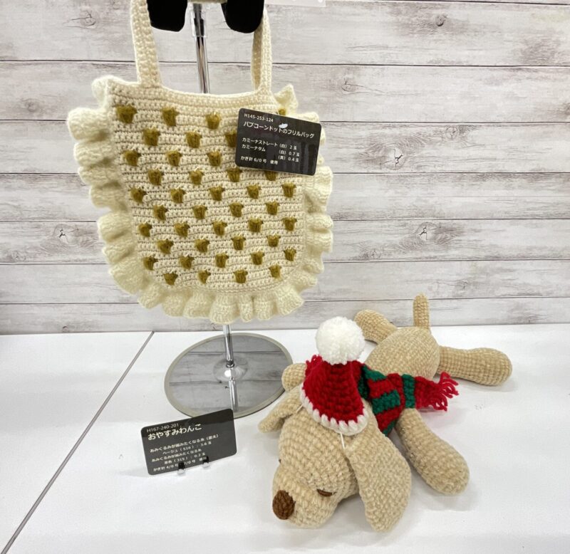 毛糸でつくるフリルとドットが可愛いフリルバッグと、手触りやわらかおやすみワンコが登場。こちらのセット、作り図も販売しております。