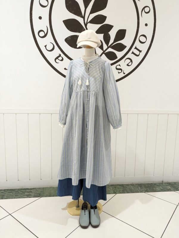 淡いストライプ柄のチュニックワンピースに、デニムのワイドパンツを合わせて、